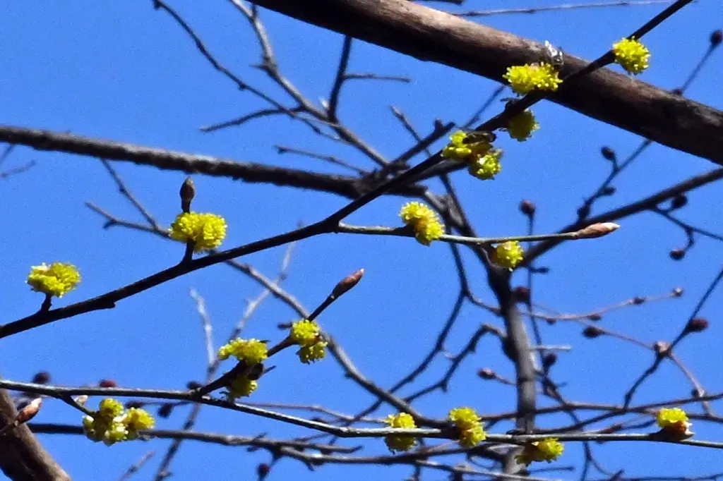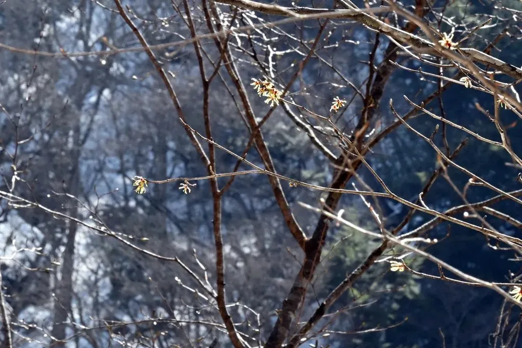 中津へ花の開花の確認に向か、中津王冠のマンサクがチラホラと咲き、